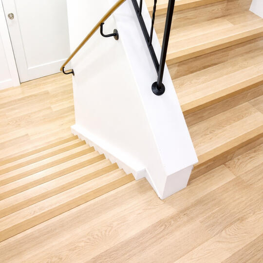 Entrance stairs refreshed with durable laminate planks. Custom cuts for perfect fit, non‑slip finish.Before/after full reno: